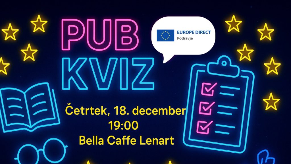 Vabljeni na tematski pub kviz, ki ga organizira Informacijska točka EUROPE DIRECT Podravje! Preverite svoje znanje, razbijte mite in se naučite kaj novega o Evropski uniji, geografiji, zgodovini, pop kulturi in še čem. To je popolna priložnost, da s svojo ekipo zasijete v bliskovitem dvoboju pameti in se potegujete za super nagrade!